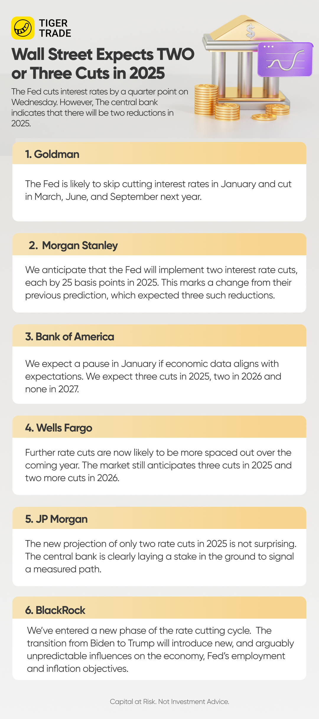 The Fed cut interest rates to 4.25%-4.5% and now forecasts two rate cuts in 2025, down from four in September. Goldman Sachs, Bank of America, and Wells Fargo predict three cuts in 2025, skipping January, while Morgan Stanley expects two 25-basis-point cuts. Fed Chair Powell emphasized a cautious approach following significant easing of monetary policy.