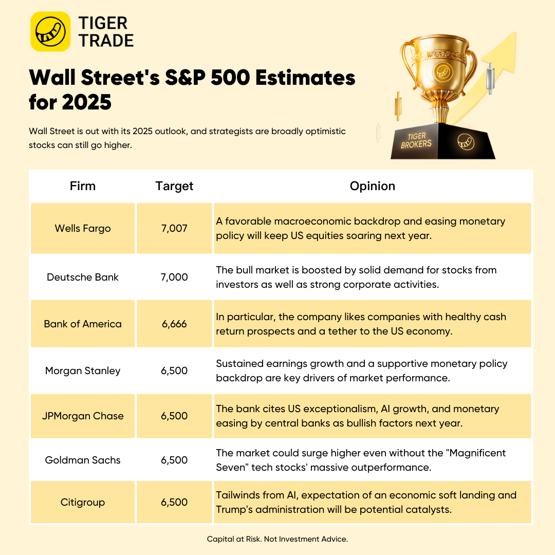 - Consensus Bullish Outlook: Most major banks predict another strong year for the S&P 500 in 2025, with target prices ranging from 6,500 to 7,007.